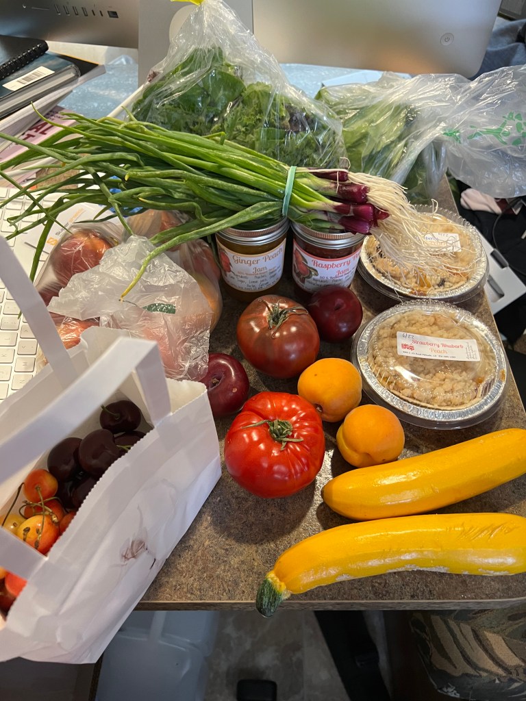 June 23, 2024 I drove out to Palisade which is only 10 minutes away from James Robb to go to their farmers market. Palisade’s Sunday farmer’s market might just be my favorite farmers market to date. It was the perfect size in that it had plenty of vendors, but it wasn’t so big that it was overwhelming. The mix of vendors was also really good in that it didn’t feel like you were looking at the same stuff just at different booths over and over again. One can only look at soaps for so long. I got a ton of stuff.